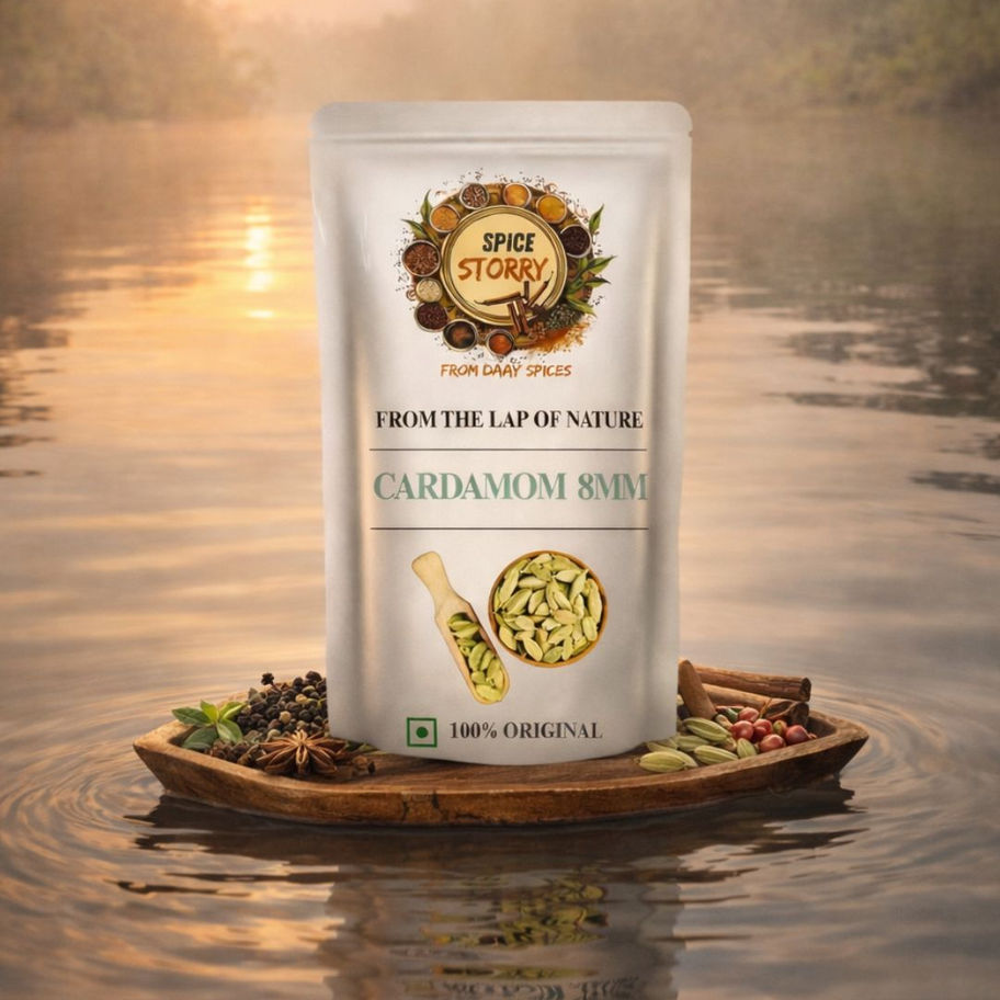 Premium Kerala cardamom, 8mm extra bold pods with intense aroma and rich flavor — perfect for enhancing tea, biryani, sweets, and curries.